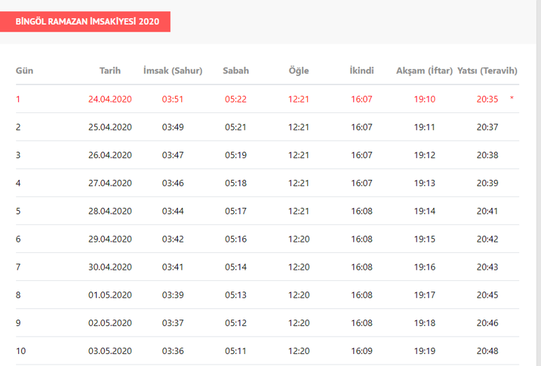 Bingol Icin 2020 Ramazan Imsakiyesi